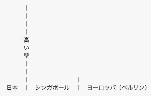 海外転職において最も難しいのは最初に日本から海外へ渡る際にある壁でそこを超えたら後は比較的楽勝ですよ、という話。言いたいことの結論を図にすればこんな感じ。 | | | | 高 い 壁 | | | | 日本 | シンガポール | ヨーロッパ(ベルリン)なん…